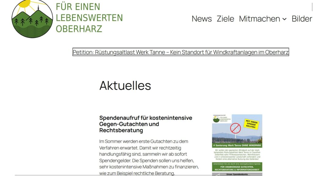 Die Initiative Für einen lebenswerten Oberharz sammelt Spenden für Gegengutachten und eine Rechtsberatung, um den bei Clausthal im Oberharz geplanten Windpark zu verhindern.