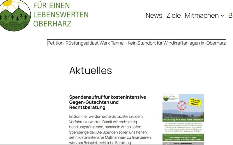 Aufrufe 22 Die Initiative Für einen lebenswerten Oberharz sammelt Spenden für Gegengutachten und eine Rechtsberatung, um den bei Clausthal im Oberharz geplanten Windpark zu verhindern. Der Spendenaufruf findet sich hier: https://lebenswerter-oberharz.de/ Spendenkonto IBAN: DE73 2689 0019 1044 6877 00Volksbank NordharzKontoinh.: NABU Goslar e.V.Betreff: „Sanierung Werk Tanne OHNE WINDPARK“(unbedingt angeben!) Zuvor hatte