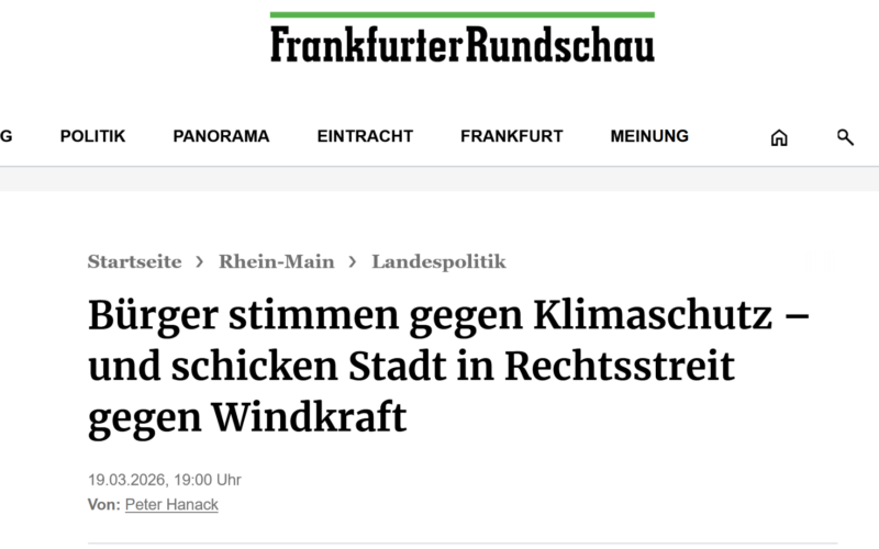 Die Frankfurter Rundschau berichtet von einem Bürgerentscheid in Bad Orb. Im Rahmen der Kommunalwahl in Hessen wurden die Bürger gefragt, ob die Stadt verpflichtet werden soll, „alle rechtlichen Maßnahmen zur Verhinderung der Errichtung von Windkraftanlagen (…) zu ergreifen“. Mehr als zwei Drittel der Bürger sprachen sich gegen die Ausweisung der